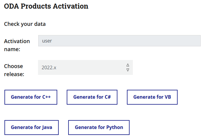 2登录表单 登录后,检查您的激活名称,如果正确,请选择您使用的ODA平台版本,然后点击"Generate for C++"。