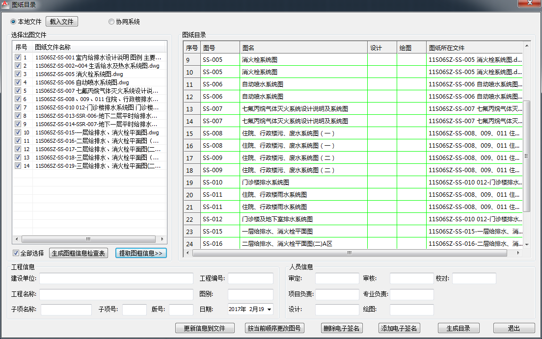 功能:批量自动提取图签信息,填写图签信息(人员信息、工程信息、图号),自动添加、删除电子签名,并生成目录,以及图框信息检查表(<strong>功能内置默认只识别标准图框,其他设计院图框请联系作者添加</strong>)。